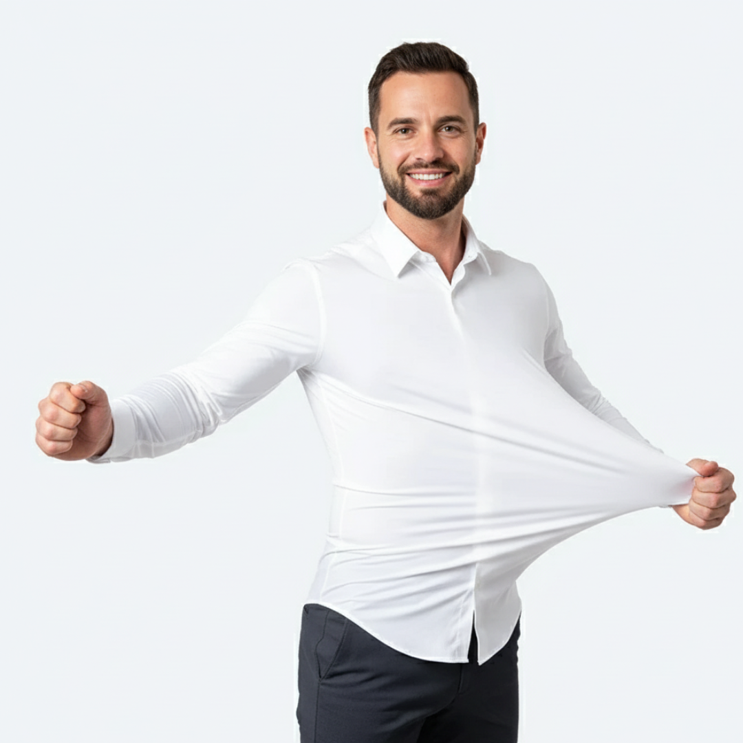 Ein Mann in einem weißen, dehnbaren Hemd dehnt den Stoff, um dessen Elastizität zu demonstrieren.